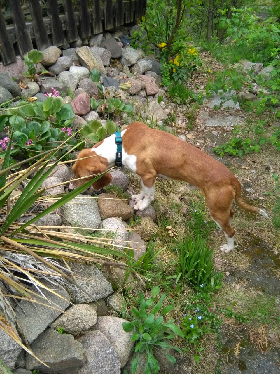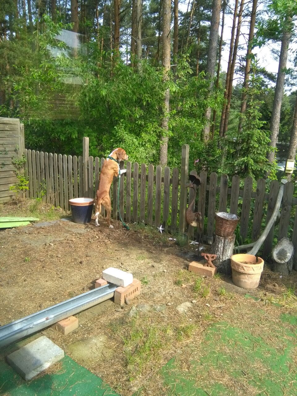 Da wo er derzeit lebt, kommt das Wild bis unmittelbar an den Gartenzaun. Der Waldrand ist in Sicht- und Riechweite. Beim Spaziergang kreuzen Hirsche, Wildschweine und sogar Wölfe den Weg. Kein Wunder, dass Paule nicht weiß, wohin mit sich. Die Reizüberflutung stresst den ambitionierten Jagdhund. Der niedrige Zaun (knapp 1,2 m) hält ihn nicht davon ab die Spuren vom Garten in den Wald zu verfolgen. Durch sie permanente Stimulation seines Jagdtriebes ist der sensible Rüde gestresst und kommt nicht zur Ruhe.