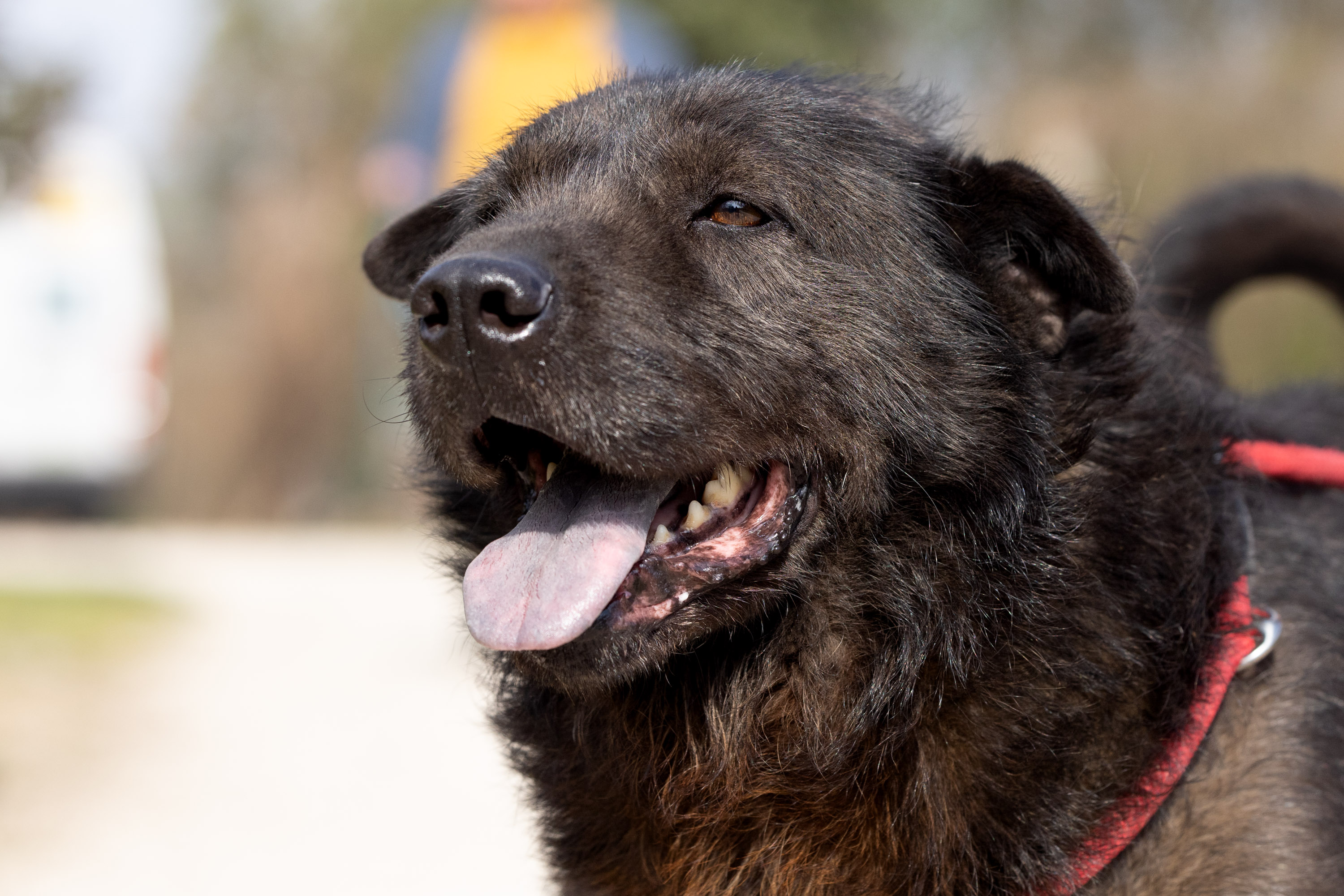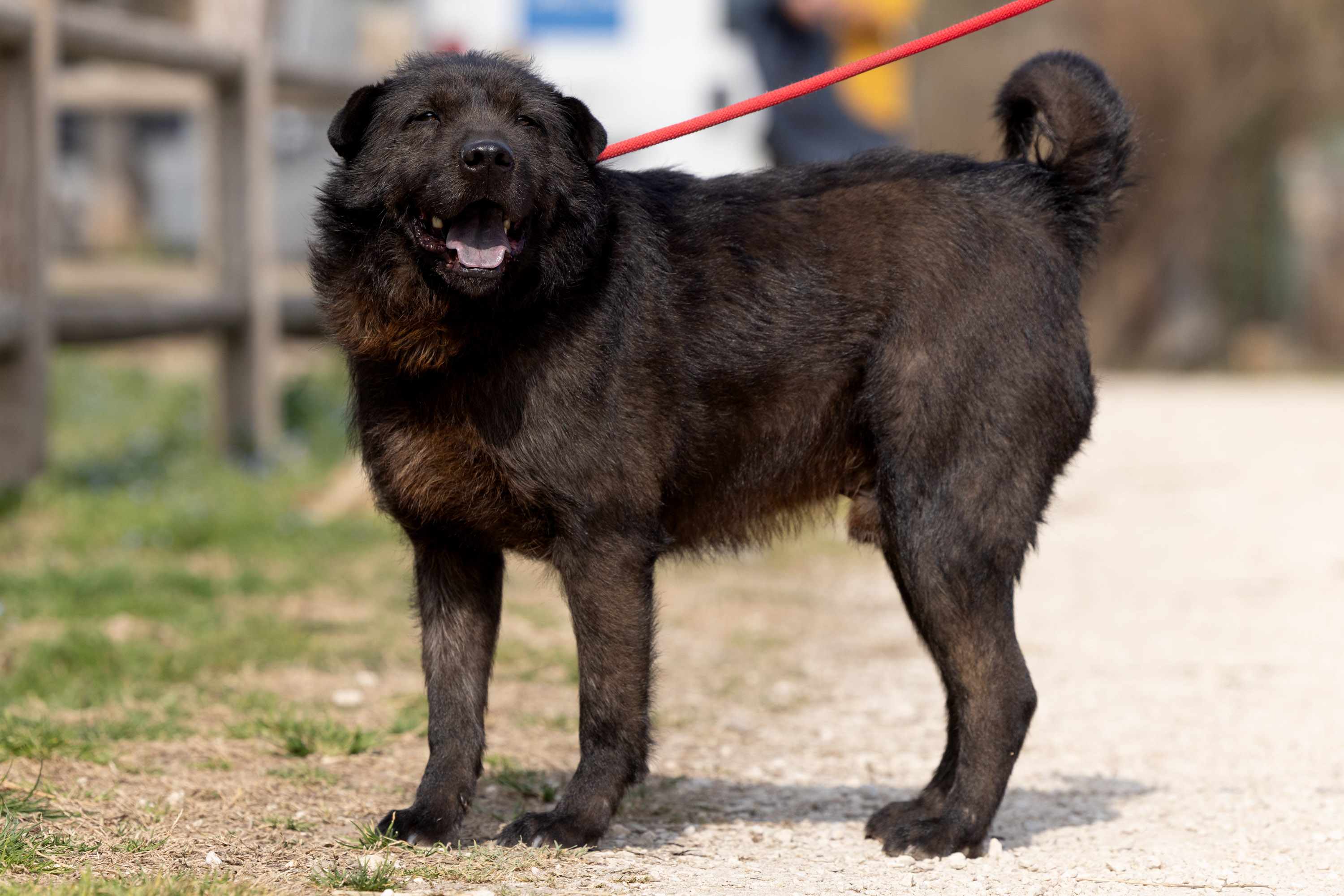 Menschen gegenüber ist er sehr zugetan, aufgrund seiner bläulich gefärbten Zunge könne ein ChowChow Mix in ihm stecken.
